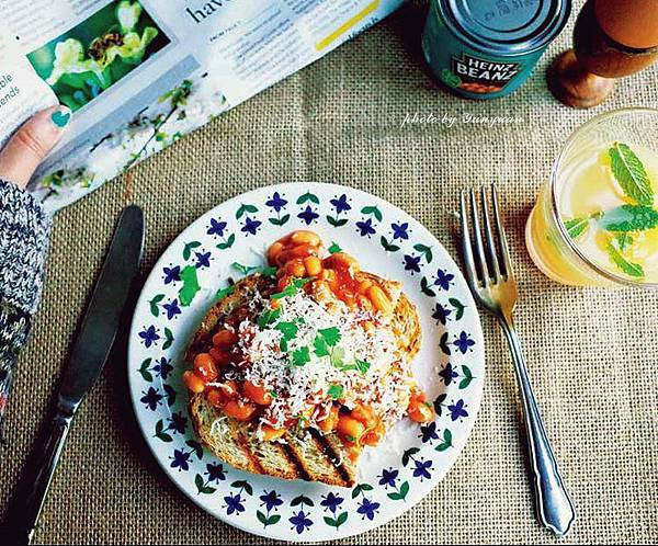 雖然無從得知英國人如此喜愛番茄燉豆的原因,但學著他們烤一片微焦的麵包,加熱一小碗的番茄燉豆(吃之前才淋上麵包,免得麵包都泡糊了)。講究點時再刨上一些帕馬森起司添滋味,點綴上一小搓巴西利增顏色。雖是便宜又平民極了的食材,但可以早上吃、中午吃,甚至是淋在白飯上-配飯吃,難怪連我這個外國人都愛它!