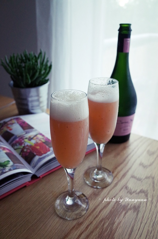 剛好家中開了瓶Rose氣泡酒,又那麼剛好的冰箱就剩了那麼一顆水蜜桃。把桃子洗洗去核,整顆丟進果汁機裡打成泥,花點功夫用小濾網,過濾成綿綿的水果泥。(以上過程只要2分鐘!) 1/3果泥加上2/3的氣泡酒,本來偏dry的酒,頓時多了點蜜桃香氣和微甜味。帶著粉紅色的氣泡酒,讓人喝得好開心啊! 在英國喝下午茶(high tea)時,非常常見的會有搭配香檳或Bellini的組合,單點一杯的話大約要10鎊~所以這一款學起來,下回在家和姊妹好友聚會時,下午茶又可以升級不少了~