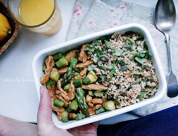 這一天本來是沒有打算帶便當的,但吃完晚餐後,看著保鮮盒那一片剩餘的豬肉片和冰箱抽屜中零星幾根蘆筍,廚房檯面上則是前天買的一把香菜,還有一大半插在玻璃水杯裡呢! 拼拼湊湊的想著隔天的午餐可以怎麼搭配。最近常吃的藜麥剛好還剩最後一餐的份量,心理掂量著咖哩口味和香菜很合拍,用來做冷便當應該適合~