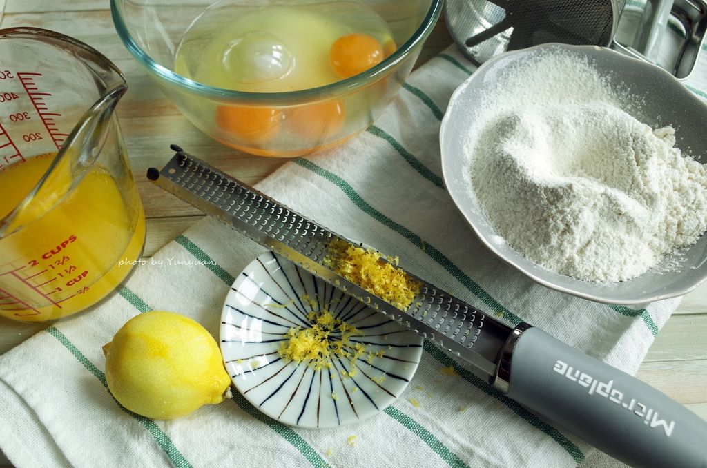 我的習慣是把所以材料都先一一成好、量好。奶油溶化後取8大匙放涼。麵粉和泡打粉混合過篩。蛋和糖放在足夠大的大碗中(因為後續會把材料加進這兒,所以不能太小)。檸檬皮刨好備用。