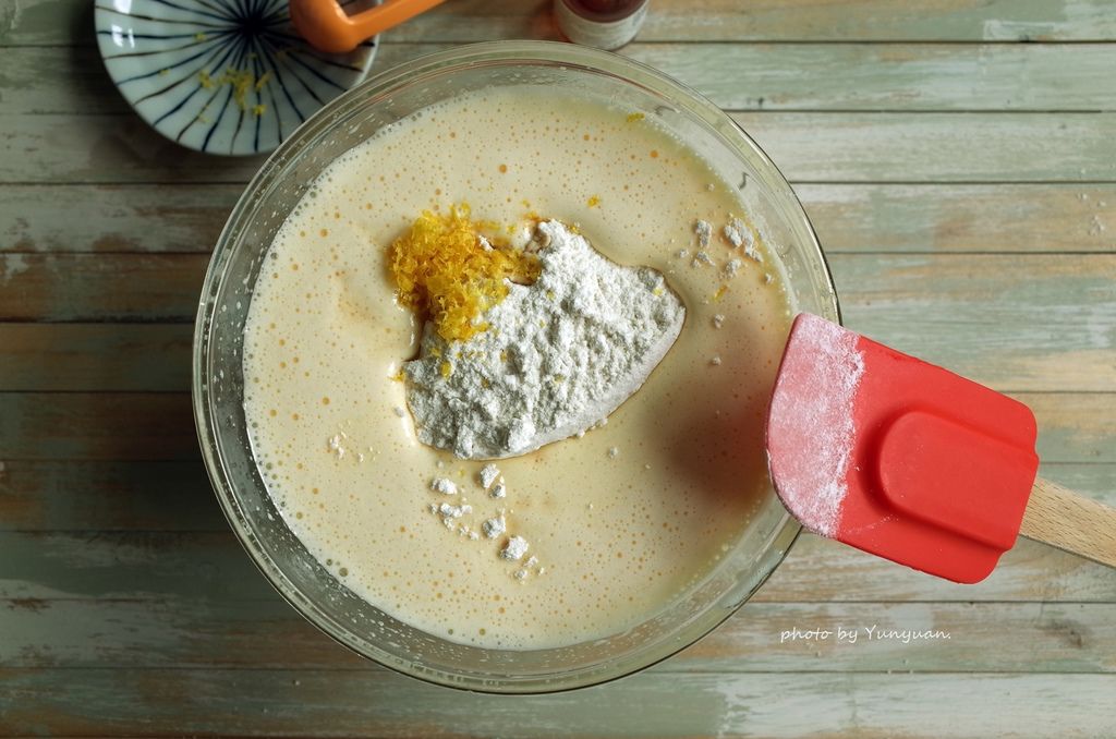 蛋和糖的混合液以手持/電動攪拌器開中速,攪拌至呈現輕盈蓬鬆的狀態。(約3-5分鐘) 接著加入香草粹取液和檸檬皮絲和混合麵粉,攪拌均勻至無粉粒狀態。