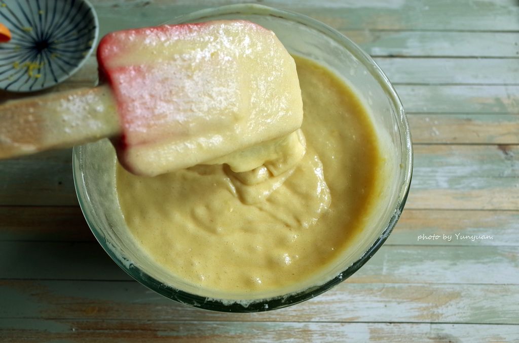 接著加入融化奶油,輕輕拌合至均勻麵糊狀。