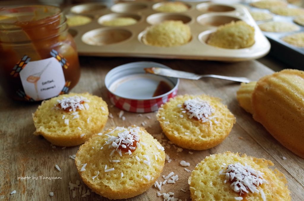 蛋糕體內部蓬鬆感很剛好,蛋香明顯。小馬芬模的則是出爐後抹上一小匙妞仔焦糖醬,撒上椰子絲作為點綴。