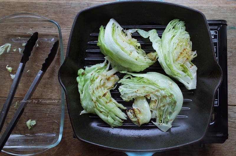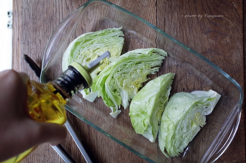 美生菜一顆剖成八片,要注意蔬菜頭的部分不要摘除,盡量讓葉片連接著頭的部分,烹調的過程中才不會容易散開。大方地淋上橄欖油,確認生菜的兩面都沾上油分。