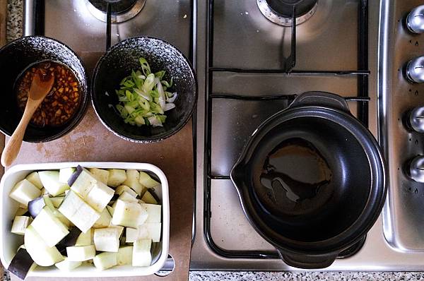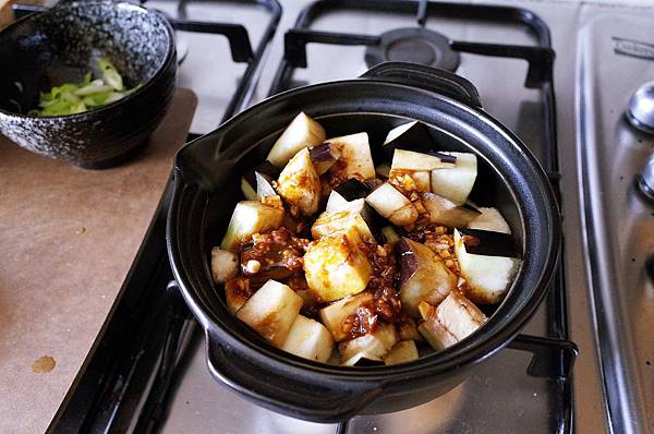 泡麵鍋先稍微加熱後加入麻油,加入茄子丁翻炒直到油都被茄子吸收,接著加入冷水(約1/3食材高度的水量),蓋上蓋子中大火加熱把茄子煮軟。(偶爾開蓋看需不需再添加水分,免得茄子黏鍋燒焦)