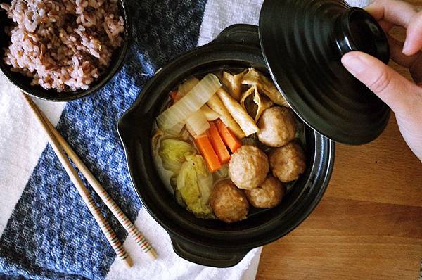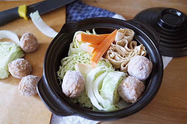 做法: 拿出小砂鍋,放入大把的大白菜、泡軟的豆皮、幾根胡蘿蔔、蒜頭和幾顆ikea的肉丸子,加入略少於食材的清水,蓋子蓋上後放到爐上開火煮滾。接著再轉小火煮10分鐘即可! 因為肉丸子本身就滿鹹了,所以通常我都不再另外調味了。我自己把它叫做超級懶人版的迷你紅燒獅子頭~配上一碗白飯吃剛剛好!