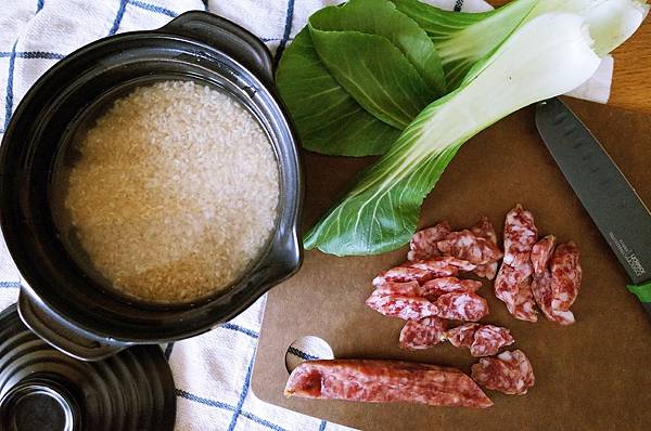 白米洗淨後倒入砂鍋,加入1.5杯的水。青江菜洗淨且小塊備用。(有時間的話白米先浸泡一小時,口感更好!