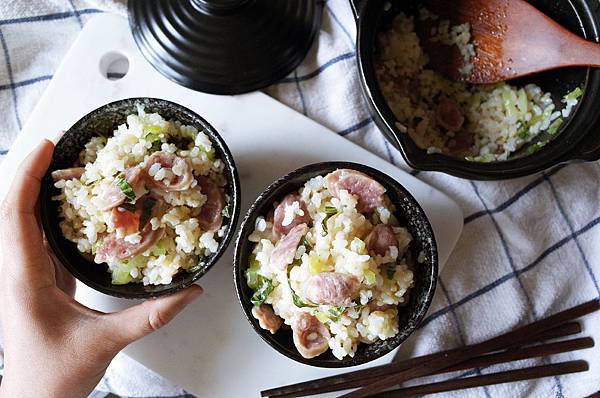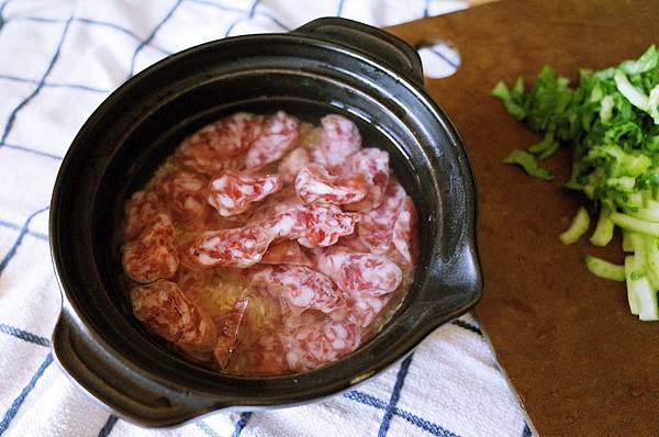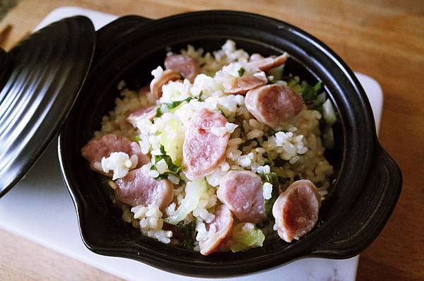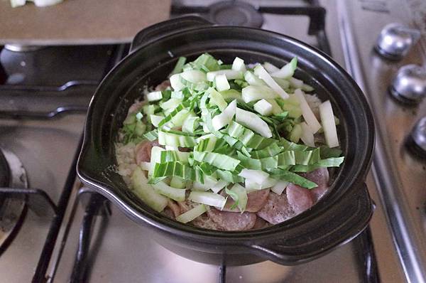 臘腸切片鋪在白米上,加蓋以小火悶煮約20分鐘。開蓋後拌入青江菜,再蓋上蓋子悶10分鐘。
