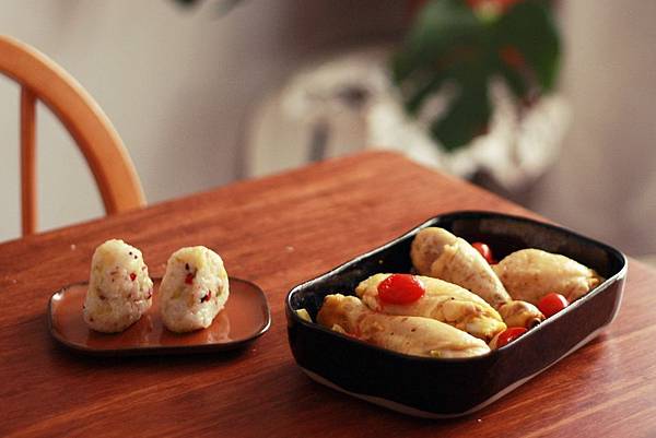 (苟己麻油飯糰:點心碟 褐棕色) (烤香料理鹽烤雞腿:主食長方深盤 深海色)
