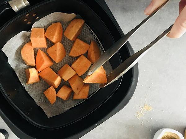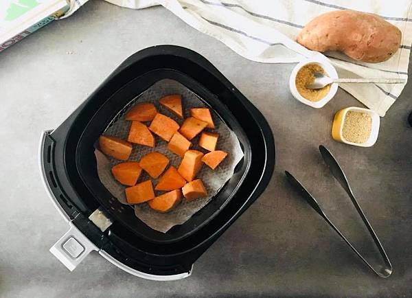2.氣炸鍋內鍋放上烘焙紙,將地瓜平舖在上方。(盡量不要重疊)
