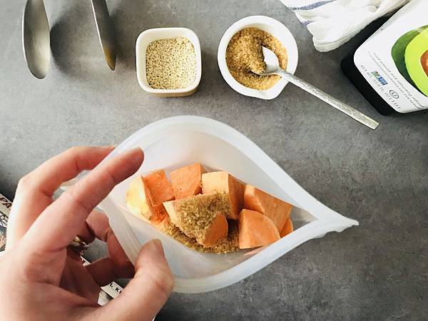 取一個袋子或保鮮盒,放入地瓜、油及糖,搖晃至糖粒大致融化且地瓜都均勻沾滿油份。