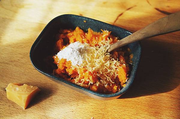 2.加入起司粉和地瓜粉,攪拌成不黏手的團狀。