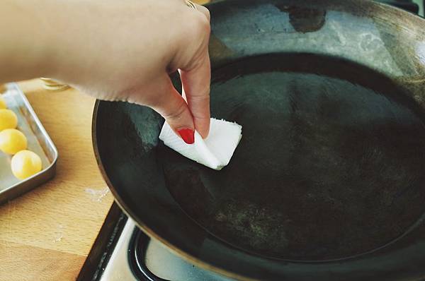 - 先熱鍋。鍋子先用中大火加熱約30秒~50秒,把手打濕後在鍋中甩一甩。如果水珠掉到鍋面上像小水球般滾動,就是鍋子的溫度夠高,達到物理性不沾的程度。