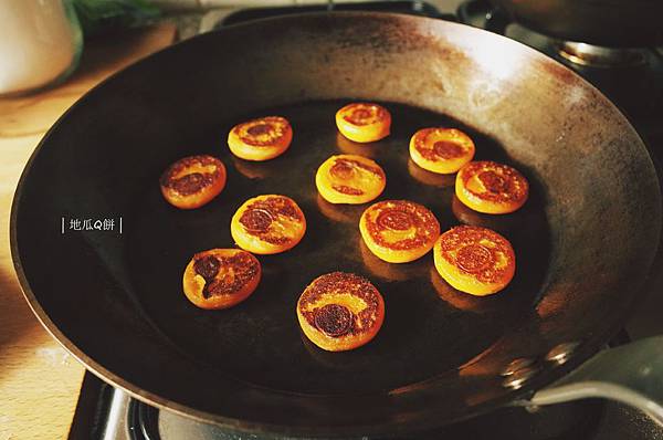 4.中火熱鍋,鍋熱後轉小火倒油。把麵團排放在鍋中,用湯匙背面壓成圓餅狀,蓋上鍋蓋悶2分鐘。