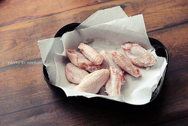 雞翅先用滾水沖一下,接著在流動的水龍頭下稍微搓洗一下表面,去雜毛髒汙。洗乾淨之後用紙巾吸乾水份。