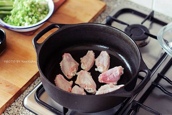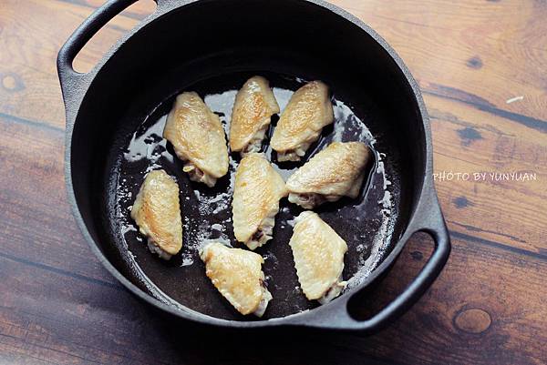 用鑄鐵鍋一鍋到底,大概10分鐘就可以完成。詹姆士的食譜裡面用的是雞腿排,我則是用了冰箱本來就有的雞翅。另外也參考了蘇發福的版本,多了放薑片的步驟。
