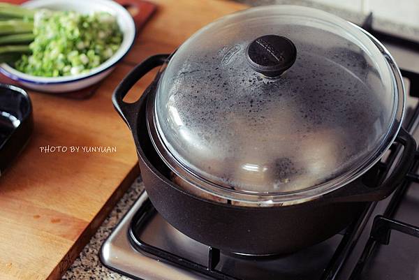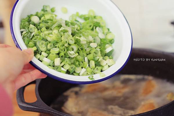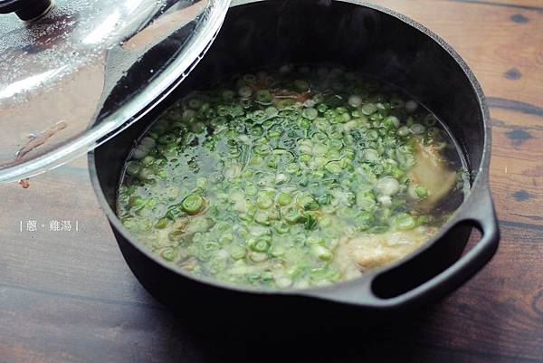 用鑄鐵鍋的好處是保溫效果非常非常好,我會在起鍋前開大火把雞湯煮沸。(是翻滾、白浪滔滔的那種沸騰喔!) 倒入蔥花、蓋上鍋蓋端上桌。