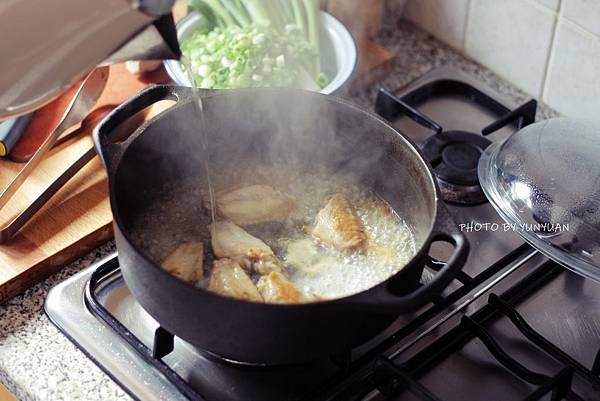 接著把雞翅放回鍋中,開中大火,沖入熱水。(根據蘇發福的食譜,滾燙的水沖入油脂中,會產生乳化作用,會讓雞湯變得有點白白的。) 不過,我這次煮,好像沒有變得白白的。