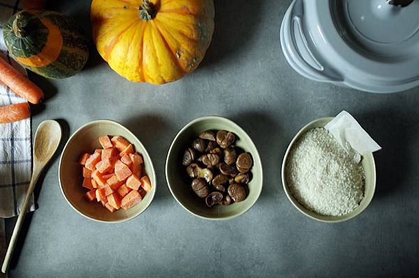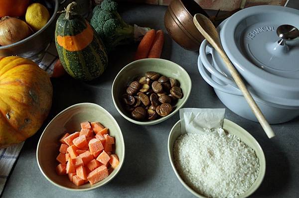 南瓜、熟栗子、白米1杯、水1.2杯、昆布柴魚高湯包、醬油一小匙