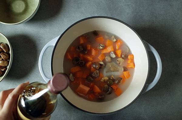 加入南瓜、栗子和醬油,蓋上鍋蓋中小火加熱約10分鐘。