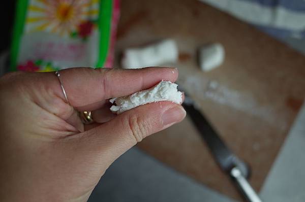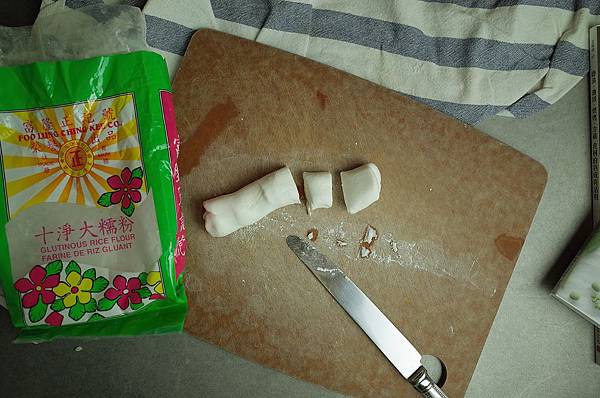 - 1.取大約半杯的糯米粉,加上一小匙糖粉,一次加一點點水一邊攪拌。直到糯米粉成糰。(可以搓成圓條不黏手的程度)
